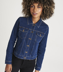 99% cotton/1% elastane. Stretch denim. Cropped ladies fit. Classic denim jacket panelling. Hanging loop. Shank button closure. Two chest pockets with flap closure. Two front pockets. Single button cuffs. Contrast twin needle stitching.